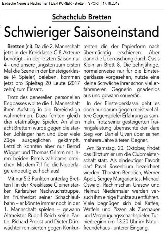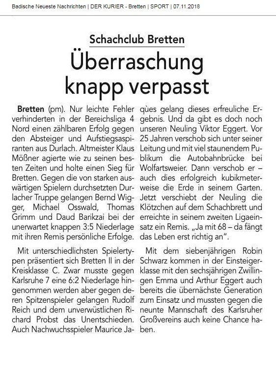 Chess club Bretten: First team succeeds in the first placeWith a reinforced team, the resurgence is the season goal of the first team of the chess club Bretten. Against Rheinstetten I managed a victory at the start. Bretten (pm) After the chess club Bretten had to hand over some good players to other clubs in recent years, only three specialists in the software industry changed living and working, the situation has relaxed a bit, and with Michael Oswald moved a strong man of Mühlacker Bretten. The immediate resurgence was therefore spent as a seasonal goal. Victory for the Bretten chess team On third-party boards, there was a big hurdle with rider reliever Rheinstetten I. Team captain Thorsten Bendrich fulfilled his task with a draw against the strongest opponent. The two old masters Klaus Mößner and Rudolf Reich brought Bretten in the lead. A small mistake of the opponent was enough to bring Günter Rätz on the winning road. After the draw of new signing Michael Oswald and the point of Daud Barikzai the important 5: 3 victory for Bretten was clear. Bretten II has to be defeated In the district class DI Bretten II (four teams) lost the first encounter against Untergrombach IV with 1: 3. Both the freshman fifth grader of the MGB Julian Dürrwächter and senior Richard Probst made a personal draw. Published on 18.10.2016 in kraichgau news