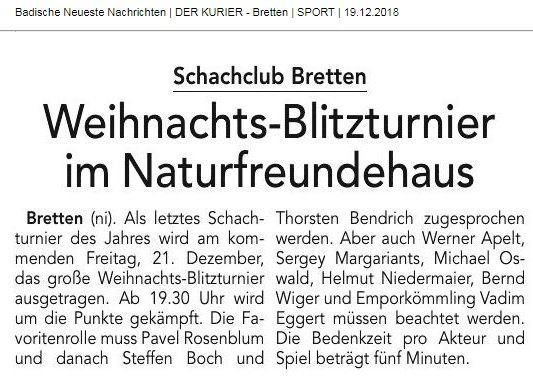 Chess Club Bretten: Annual General Meeting and Blitz tournamentAt its general meeting, the chess club Bretten invites you on 20 April in the club restaurant of the TSV Rinklingen. Next Friday, April 20, at 18.30 clock in the club restaurant of the TSV Rinklingen the general meeting of the chess club Bretten instead. The agenda includes reports and new elections. After that there will be a meal. The vast majority enjoy chess and other board games. For the experts then begins the big blitz tournament for the city championship. Steffen Boch, Thorsten Bendrich, Rachimschan Urasov and Pavel Rosenblum are favored. But also Werner Apelt, Sergey Margariants and Helmut Niedermaier will have to be considered. Published on 16.04.2018 in kraichgau news