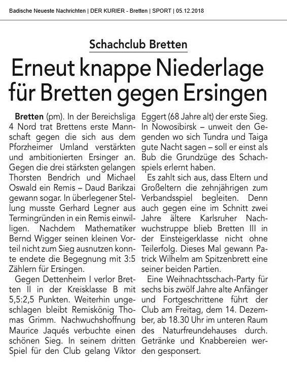 Schachclub Bretten refers to youth cheatsListenelement 1The Bretten chess club I prevailed just against the team from Sulzfeld. Bretten (pm) In the game of the chess club Bretten against the team from Sulzfeld the Brettener had to do without two strong players. Against the strong Sulzfelder this would have almost gone. After Günter Rätz had won sovereign on Brettener side and played Thorsten Bendrich and Thomas Grimm Remi, also two defeats had to be accepted. So after five games a close 3: 2 lead for the Brettener. After then Gerhard Legner and Helmut Niedermaier had their games for themselves and Rachimschan Urasow had played a draw, resulting in the close 4.5: 3.5 victory for the Brettener. These may continue to have legitimate advancement hopes through the victory. Published on 18.01.2018 in kraichgau news